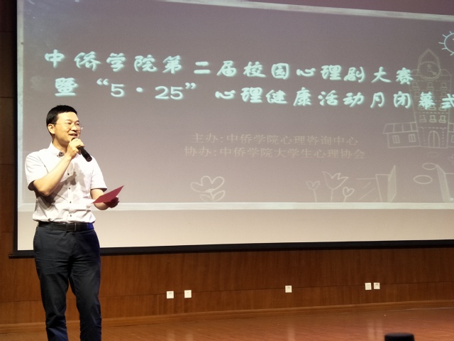 2017年5月23日下午四点,由我院心理咨询中心主办的中侨第二届心理剧大赛在图文信息楼二楼报告厅举行。学院党委书记陈俊傲书记、人事处处长吴蓓蓉、校党委办公室主任校团委书记朱范鑫、基础部主任周文静、机电系主任李国栋以及各系书记出席本次大赛。 本次大赛共有七个系参加比赛,每个剧目都由我们学生自编自导自演,内容均来自我们大学生的校园生活。在表演中,同学们不仅通过语言深挖内心戏,而且融合了舞蹈、音乐和歌曲等丰富的表演形式,展现我校大学生的心理困扰和梦想的同时,也给大家带来了美好的视觉享受。 比赛结束,党委书记陈俊傲书记致辞,对同学们的精彩表演给予了高度赞赏,同时,也对我们的工作给予肯定,并对未来我校心理剧的开展提出了建议。