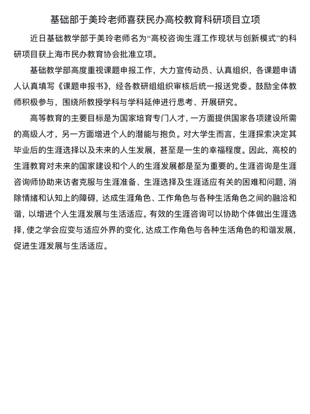 基础部于美玲老师喜获民办高校教育科研项目立项