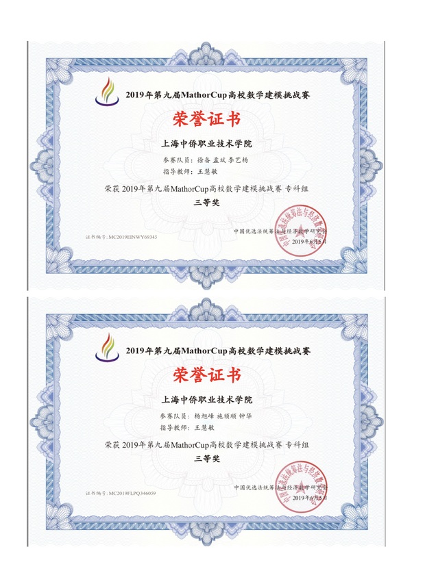 我校荣获“2019Mathorcup高校数学建模挑战赛”全国专科组二、三等奖