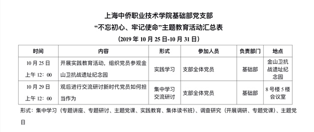 上海中侨职业技术学院基础部党支部“不忘初心 牢记使命”主题教育活动汇总表