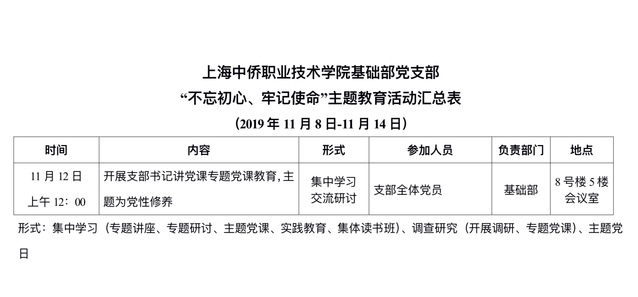 上海中侨职业技术学院基础部党支部 “不忘初心、牢记使命”主题教育活动汇总表
