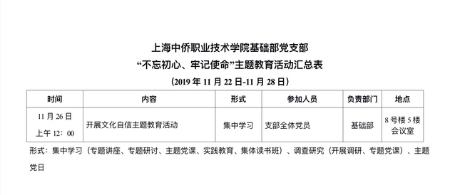 上海中侨职业技术学院基础部党支部 “不忘初心、牢记使命”主题教育活动汇总表