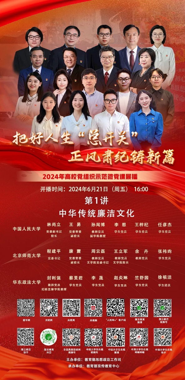 6月21日(周五)16:00,机关第五党支部组织党员教师采用自主学习的方式,关注微言教育微信,通过微言教育视频号、快手号、抖音号、微博等平台收看直播,跟随中国人民大学、北京师范大学 、华东政法大学师生,走进2024年高校党组织示范微党课展播第一讲《中华传统廉洁文化》。